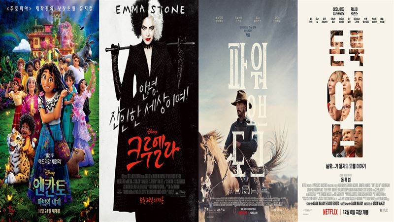 (왼쪽부터)<엔칸토>, <크루엘라>, <파워 오브 도그>, <돈 룩 업> 포스터(사진=다음 영화).