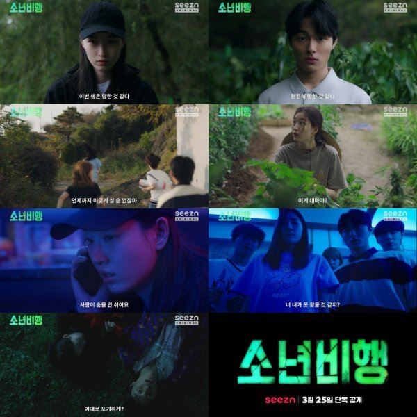 오는 25일(금) 첫 공개될 OTT seezn <소년비행>(극본 정수윤/ 연출 조용익/ 제작 플레이리스트)은 부모에게 마약 운반 수단으로 이용당하던 18세 소녀 경다정(원지안 분)이 쫓기듯 내려간 시골에서 현생이 벅찬 촌놈 공윤탁(윤찬영 분)과 그 친구들을 만나 대마밭을 발견하며 펼쳐지는 10대 느와르 드라마다.