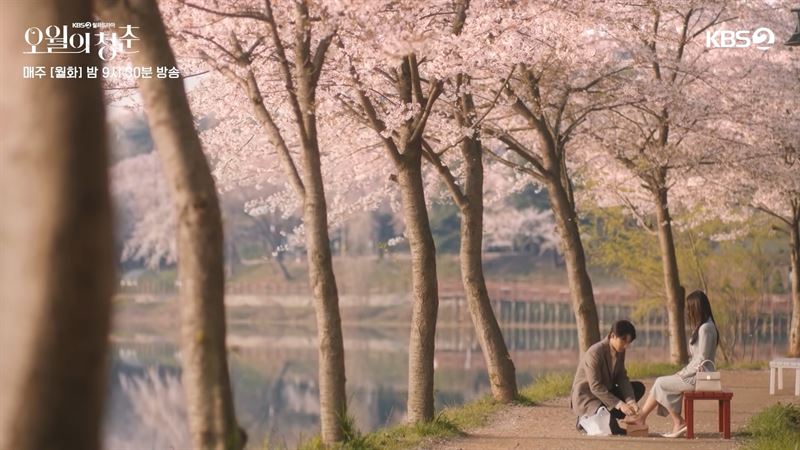 '오월의 청춘'에서 벚꽃은 둘의 사랑을 알리는 장치로 활용된다.
