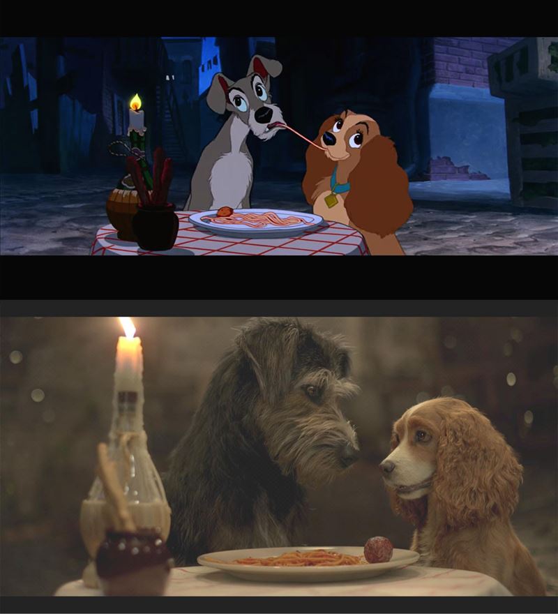 캐릭터의 모습뿐만 아니라 원작에서 보여주는 행동, 말투까지 완벽하게 재연해냈으며, 레이디와 트램프 주변의 다른 강아지들도 그렇게 비슷할 수가 없다.