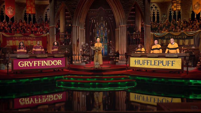 '리포터: 호그와트 토너먼트' 진행자 배우 헬렌 미렌과 참가자들(사진=유튜브 TBS 캡처). ⓒOTT뉴스
