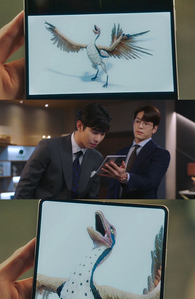 시조새를 보게 된 강태무와 손수 검색해서 보여주는 비서 차성훈(김민규 분)(사진=웨이브). ⓒOTT뉴스