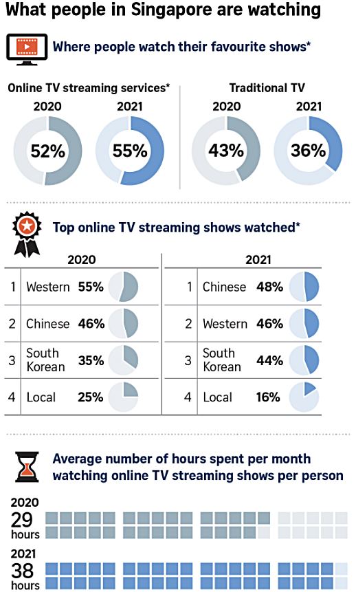 보고서에 따르면 싱가포르 시청자의 55%가 지난해 넷플릭스, 아이치이 등 OTT 서비스에서 자신들이 가장 좋아하는 프로그램을 시청했다고 답한 것으로 나타났다.