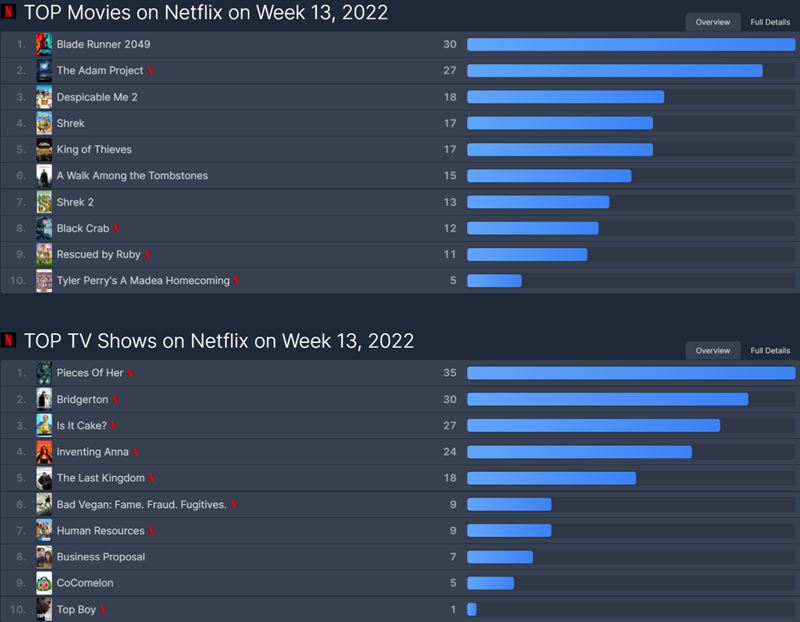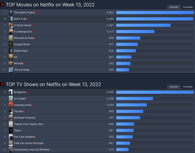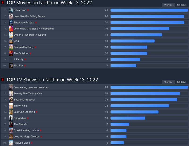 '애덤 프로젝트'는 3위를 기록했으며, '구조견 루비'는 7위다. 2018년 공개된 넷플릭스 영화 '버드박스'가 10위에 차트인 된 것이 특이하다.