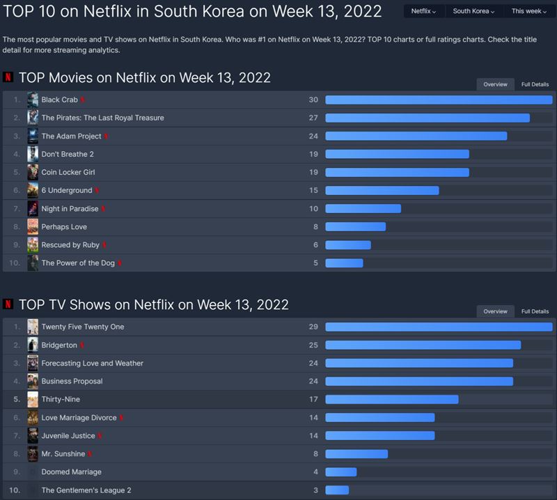 또한 '기상청 사람들'도 10위로 차트인하며 넷플릭스 세계 TV프로그램 부문에 한국드라마는 총 3개로 K-콘텐츠의 위상을 보여주었다.