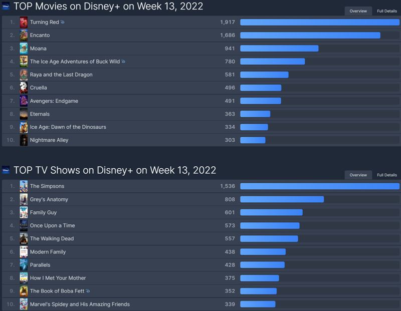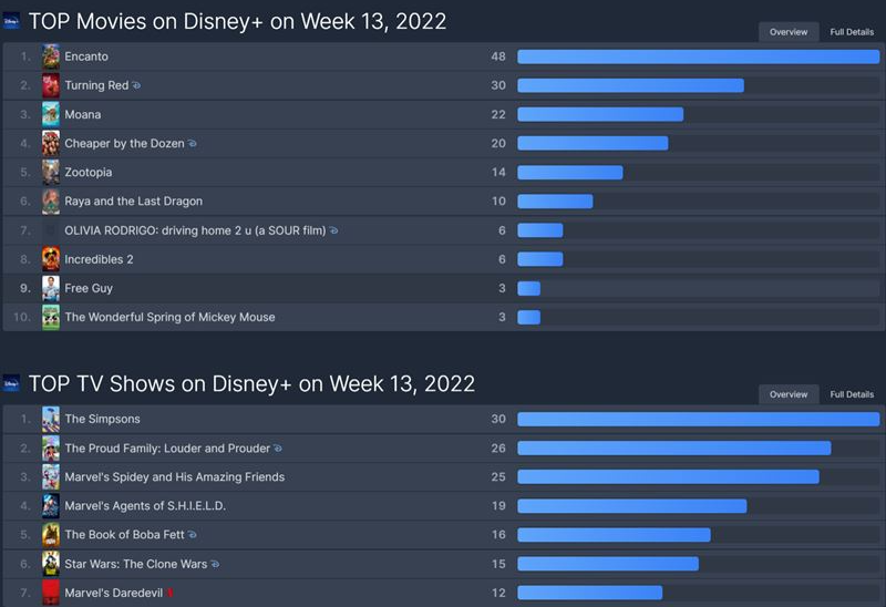 디즈니플러스 미국 영화 부문은 1위 '엔칸토', 2위 '메이의 새빨간 비밀', 3위 '모아나'로 여성 주인공 애니메이션의 저력을 보여줬다.