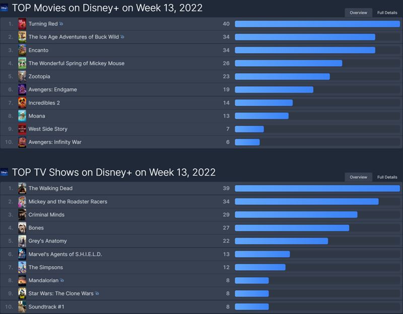 디즈니플러스 전 세계 영화 부문은 '메이의 새빨간 비밀'이 공개 이래 3주 연속 1위를 유지하고 있다.
