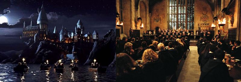 호그와트로 향하는 학생들과 호그와트 연회장에 모인 학생들(사진=다음영화). ⓒOTT뉴스