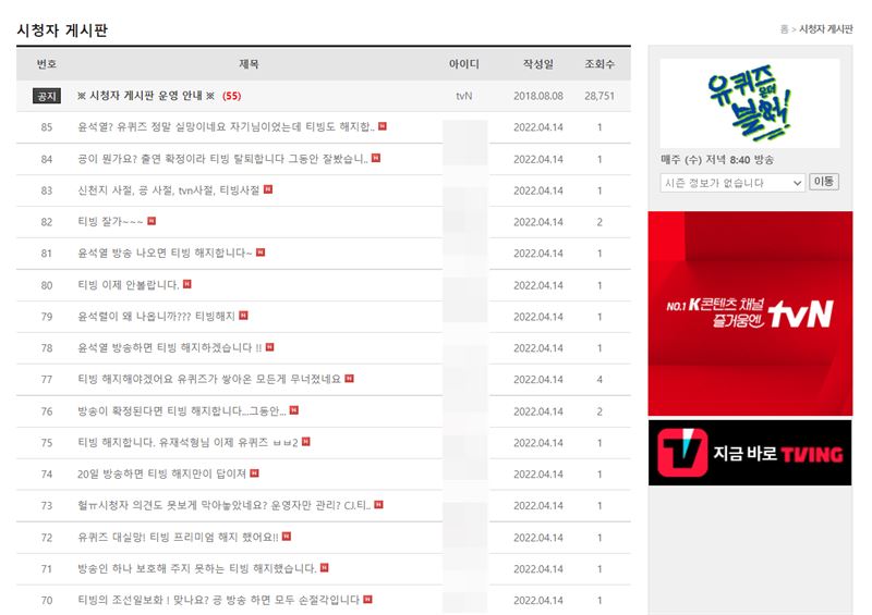 '유퀴즈' 시청자 게시판에 티빙 구독 해지 글이 다수 올라오고 있다(사진='유퀴즈' 홈페이지 캡처). ⓒOTT뉴스