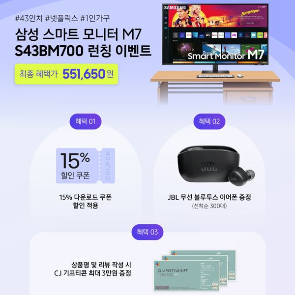 삼성전자 디스플레이 공식파트너 큐소닉(대표 이관구)이 응답속도 향상, 화상 카메라 연결 기능, 스마트홈 IoT 허브 기능으로 더욱 강력해진 ‘삼성 스마트 모니터 M7 S43BM700’ 43인치 모델을 4월 15일에 공식 출시한다고 밝혔다.