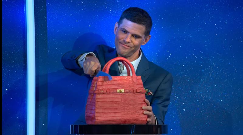 MC가 칼로 물건을 자르면서 케이크의 정체를 공개한다(사진=넷플릭스 캡처). ⓒOTT뉴스
