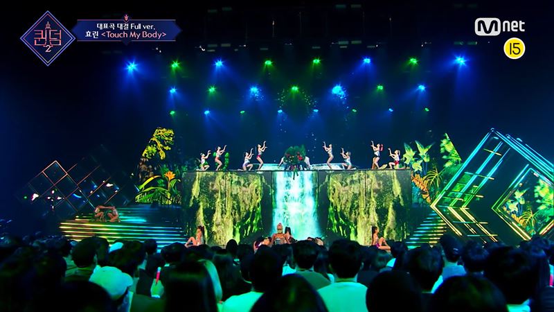 높은 무대 장치를 활용해 정글 속 폭포 연출을 선보인 효린의 'touch my body' 무대(사진='퀸덤 2' 공식 네이버TV 캡처). ⓒOTT뉴스