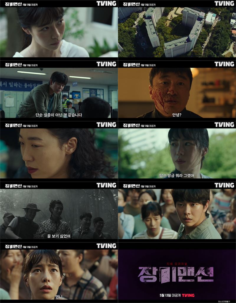 오는 5월 13일(금) 첫 공개되는 티빙 오리지널 시리즈 '장미맨션'(연출 창감독, 극본 유갑열, 제공 TVING, 제작 SLL, 공동제작 비에이엔터테인먼트·필름몬스터)이 26일, 극강의 서스펜스가 ‘숨멎’ 긴장감을 자아내는 메인 예고 영상을 공개했다. 사라진 언니, 어딘가 수상한 이웃들의 면면이 소름을 유발하며 미스터리를 고조시킨다.