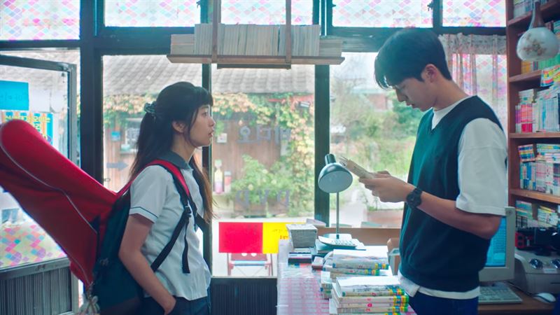 책 대여점의 백이진(오른쪽)과 단골 여고생 나희도(왼쪽)의 모습(사진=티빙). ⓒOTT뉴스
