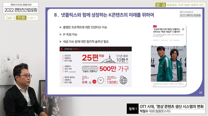 넷플릭스 오리지널 시리즈 '지금 우리 학교는'을 제작한 필름몬스터의 박철수 대표가 첫 발제자로 나서 'OTT 시대, '영상'콘텐츠 생산 시스템의 변화'에 대해 설명했다.