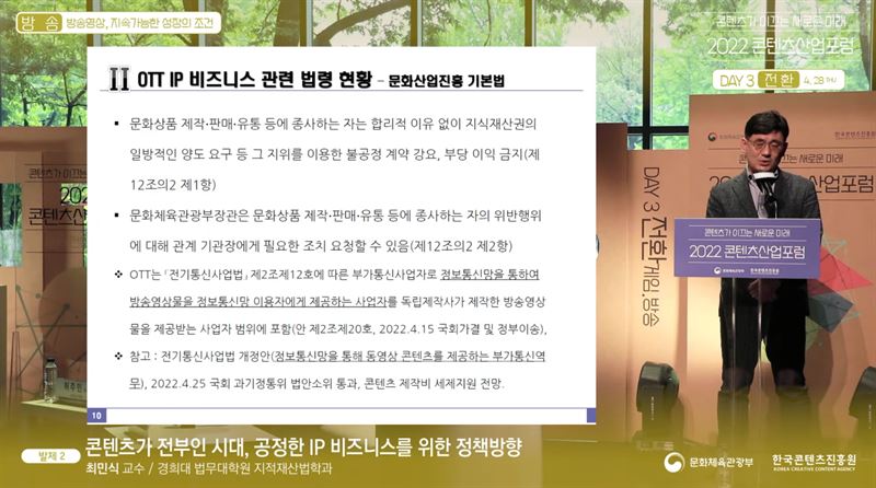 두 번째 발제를 통해 '콘텐츠가 전부인 시대, 공정한 IP 비즈니스를 위한 정책방향' 세션에서 최민식 교수는 "글로벌 OTT에 의한 국내 콘텐츠 저작권 수익 독점으로 국내 콘텐츠 시장의 종속 우려가 있다. 또한 추가적으로 발생하는 수익이 창작자에게 돌아가지 않고 있다"고 지적했다.