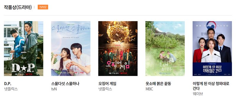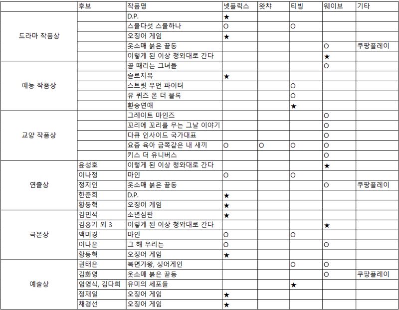'D.P.', '오징어 게임', '이렇게 된 이상 청와대로 간다', '소년심판' 등 다양한 OTT 오리지널 콘텐츠가 후보에 올라와 있기 때문이다.