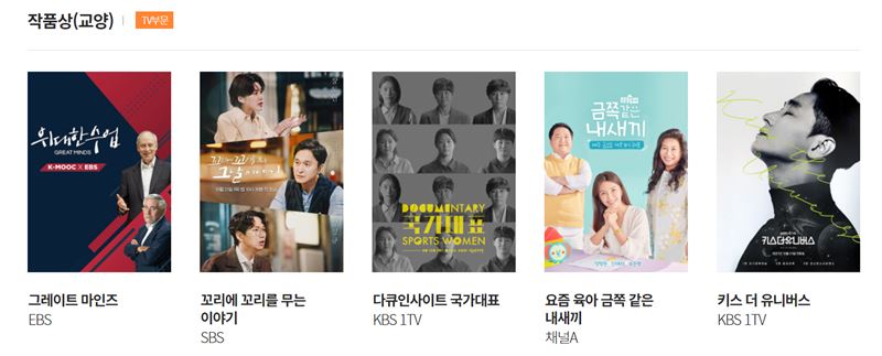 이외에도 유명 교수진의 강의를 담은 '그레이트 마인즈', 도쿄 올림픽 열풍의 주역을 담은 '다큐인사이트 국가대표', 우주의 비밀을 밝히는 생생한 현장을 그려낸 '키스 더 유니버스'가 후보에 올랐다.