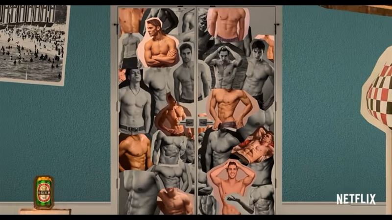 애버크롬비 & 피치 모델 사진으로 꾸며둔 캐비닛을 재연한 모습(사진=넷플릭스 유튜브). ⓒOTT뉴스