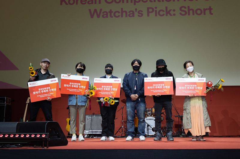 이어 ‘왓챠가 주목한 단편상’은 총 5개 작품이 수상했다. △친한 친구 사이에서 아가씨와 새언니가 된 두 여성의 갈등을 유쾌하게 풀어낸 김인혜 감독의 ‘그렇고 그런 사이’ △다양한 연기를 갈구하나 좀비 역할로 쓰임만 당하는 무명배우의 이야기를 그린 국중이 감독의 ‘29번째 호흡’ △1995년 한 여자 기숙학원의 실제 방화사건을 모티프로 한 유종석 감독의 ‘새벽 두시에 불을 붙여’ △헤어진 연인이 10년의 세월을 거쳐 세번의 여름날 우연히 마주치게 되는 백시원 감독의 ‘겹겹이 여름’ △알바로 생계를 잇는 청년과 노모를 부양할 돈이 없어 쩔쩔매는 중년이 편의점에서 뜻밖의 결투를 벌이는 김민주 감독의 ‘트레이드’가 수상했다.