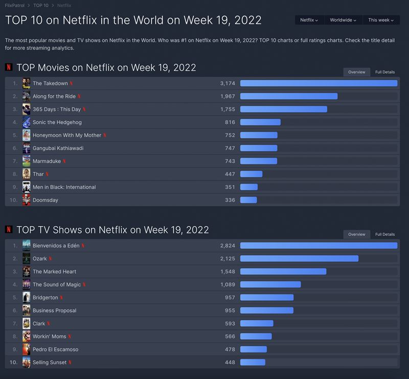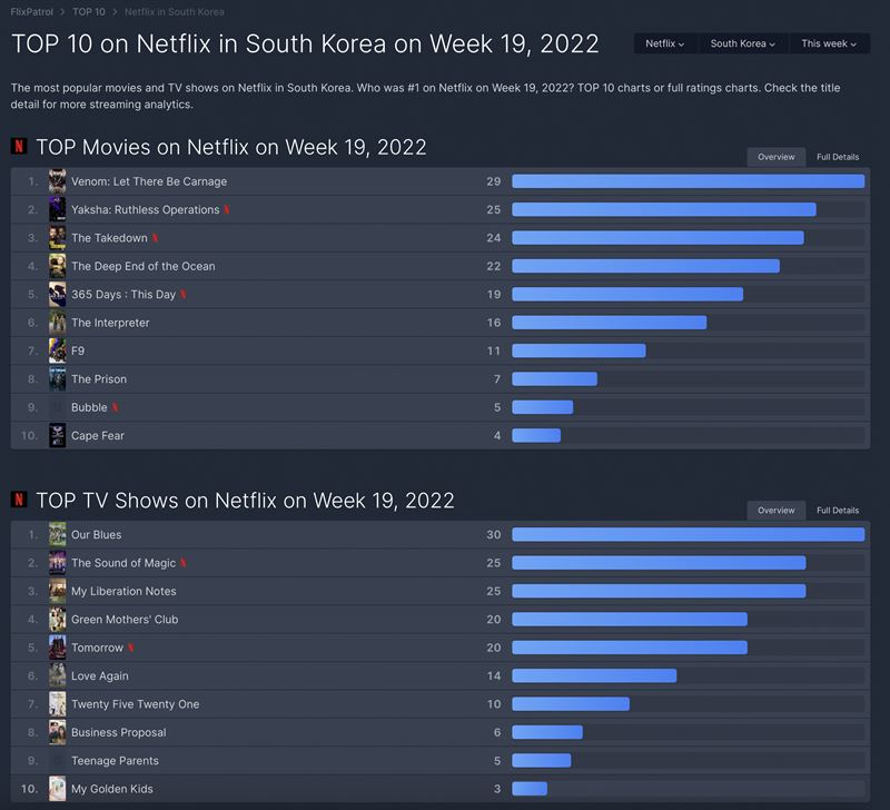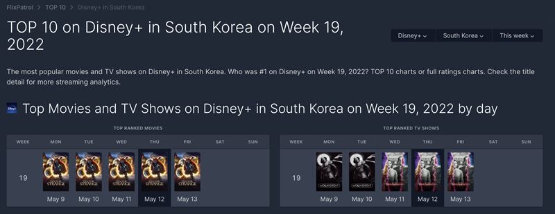 [편집자 주] 글로벌 OTT 순위 집계 사이트 플릭스 패트롤이 공개한 5월 2주차 넷플릭스ㆍ디즈니플러스 콘텐츠 순위를 OTT뉴스가 소개합니다.