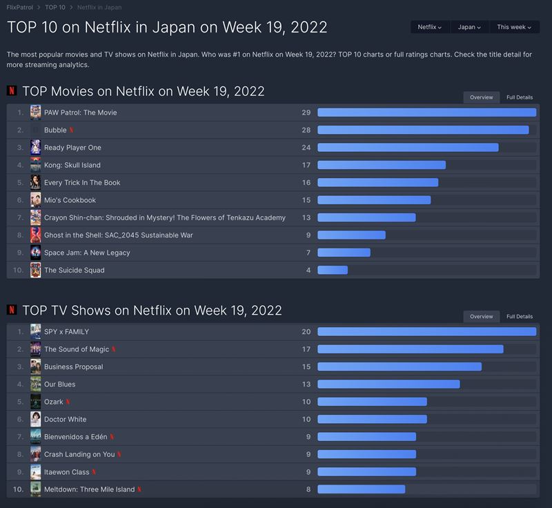 넷플릭스 일본 영화 부문 1위는 가족 애니메이션 '퍼피 구조대 더 무비'가 차지했다.