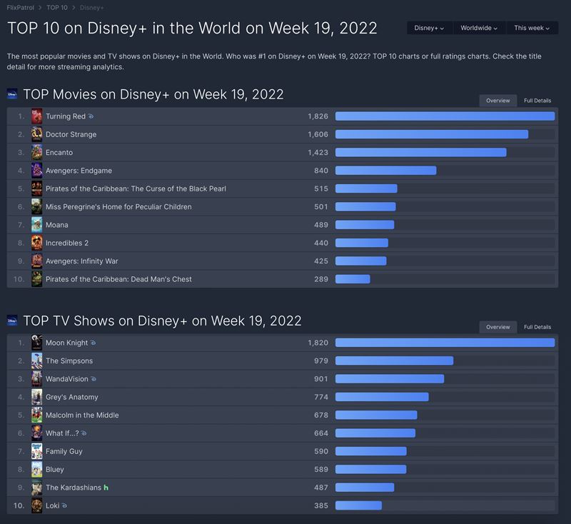 지난 주 2위와 3위에 오르며 '문나이트'를 턱끝까지 추격한 '완다비전'과 '왓 이프..?'는 이번주 각각 3위와 5위로 내려갔다.