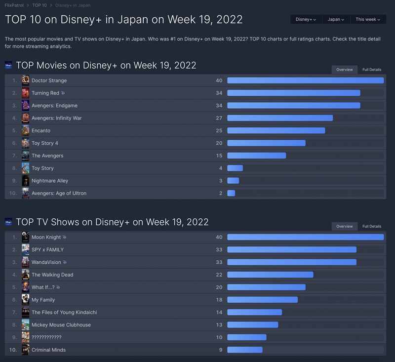 일본의 디즈니플러스 영화 부문 순위에서는 특히 마블의 힘이 더욱 돋보인다.