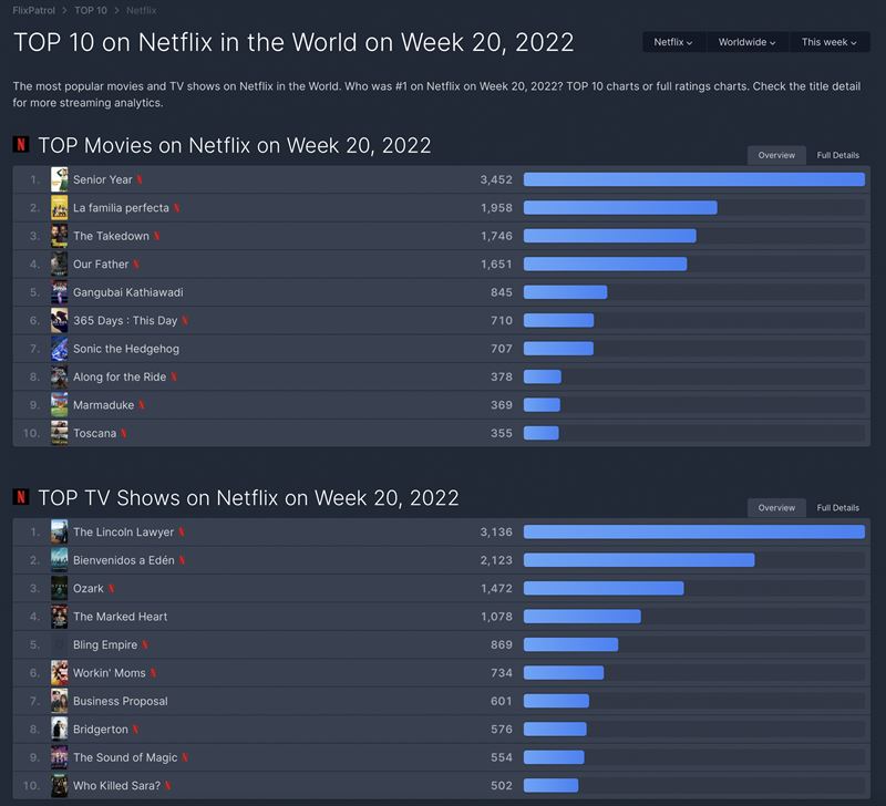 [편집자 주] 글로벌 OTT 순위 집계 사이트 플릭스 패트롤이 공개한 5월 3주차 넷플릭스ㆍ디즈니플러스 콘텐츠 순위를 OTT뉴스가 소개합니다.