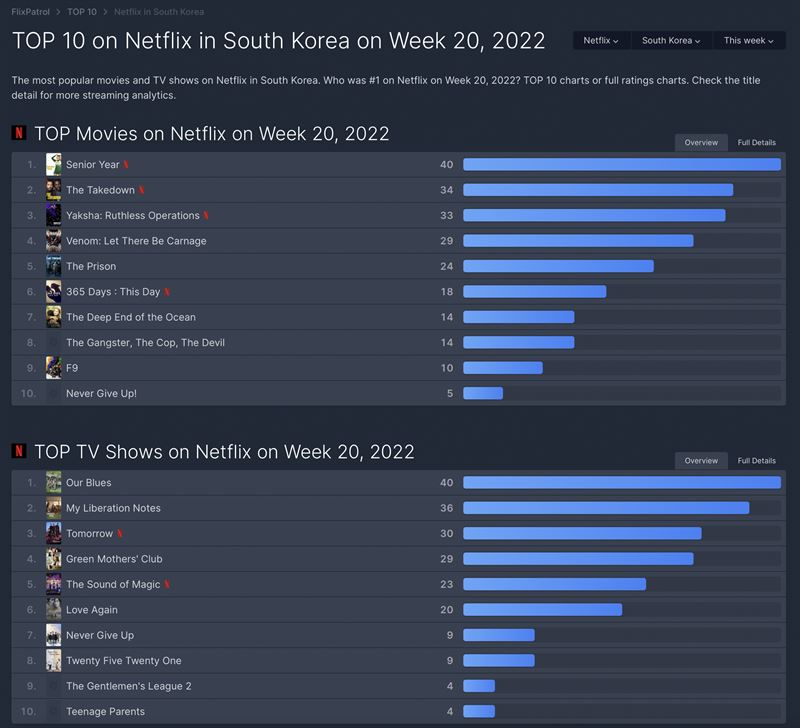 넷플릭스 한국 영화 부문 1위는 세계 순위와 동일하게 '시니어 이어'가 차지했다.