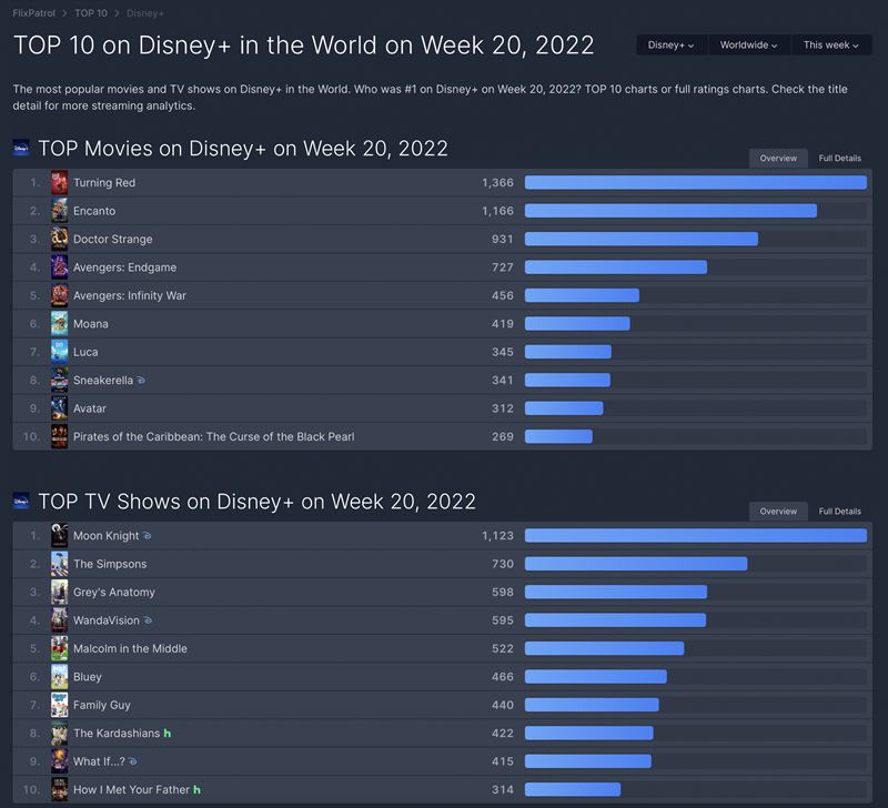 디즈니플러스 세계 TV 부문 1위와 2위는 역시 '문나이트', '심슨 가족'이다.