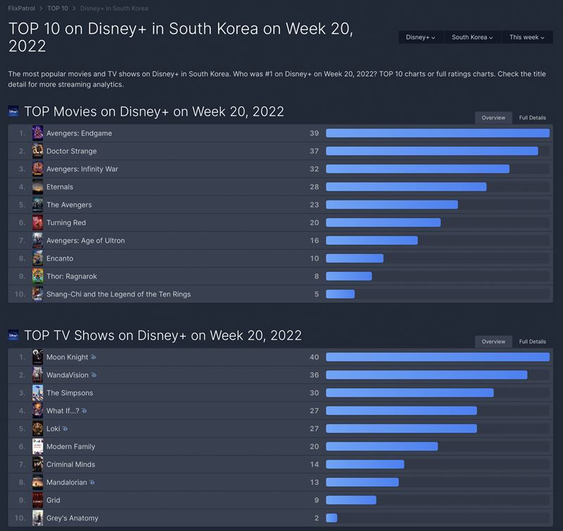 디즈니플러스 한국 TV 부문 순위 역시 마블로 대표된다. 지난주 '완다비전'에 1위 자리를 내줬던 '문나이트'가 다시 1위를 탈환했다.