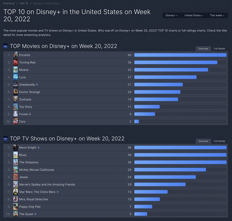 디즈니플러스 미국 TV 부문에서도 1위인 '문나이트'와 6위인 '마블 스파이디 그리고 놀라운 친구들'을 제외하면 다른 마블 콘텐츠는 찾아보기 힘들다.