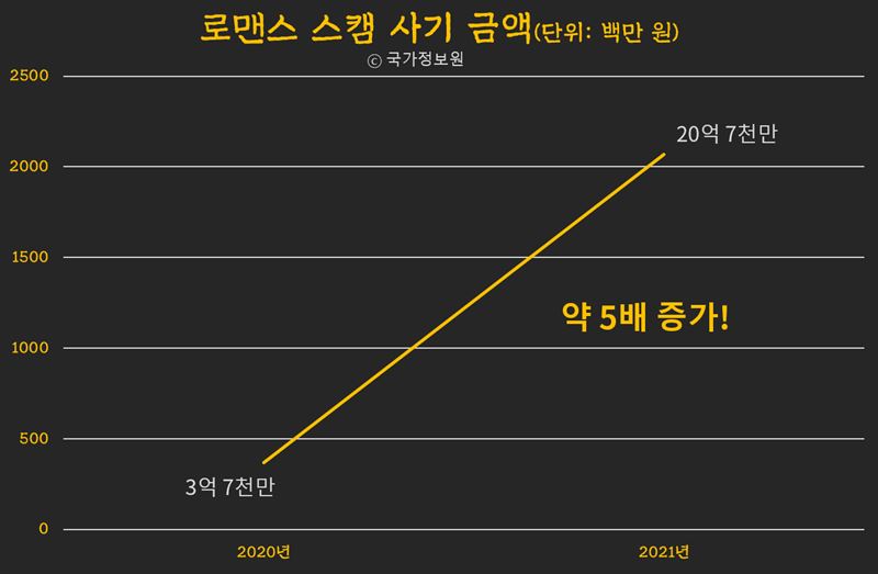 국가정보원에 따르면 지난해, 로맨스 스캠으로 인한 피해 금액이 무려 20억, 재작년보다 5배가량 늘어났다.