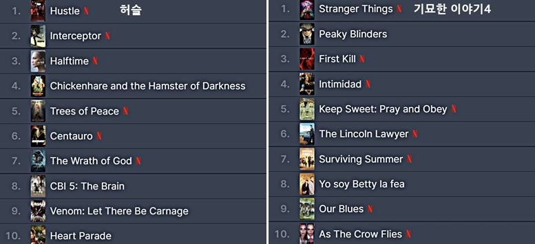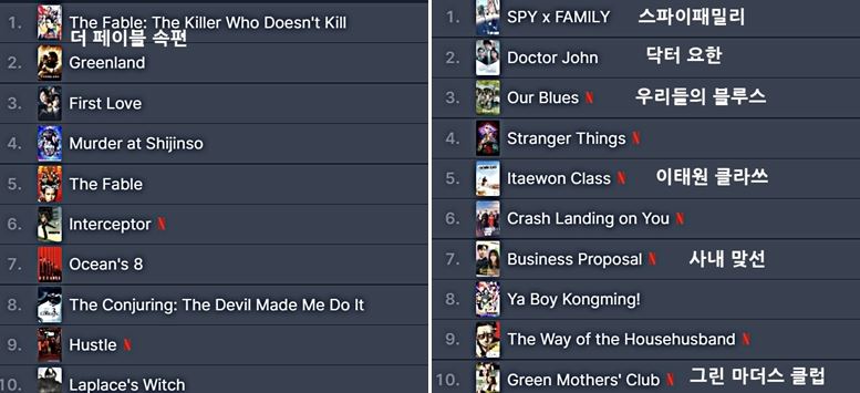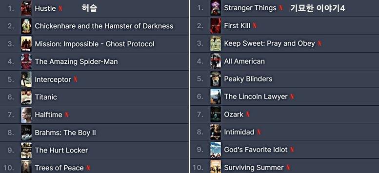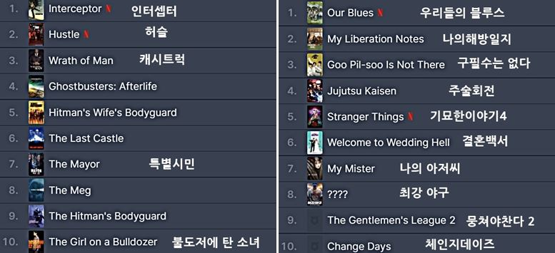 넷플릭스 전세계 2022년 24주차 영화/TV 부문 TOP 10 (왼쪽 : 영화 / 오른쪽: TV 부문)