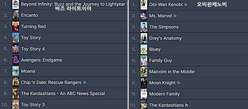 미국 디즈니플러스 영화 부문에서는 지난 주에 이어 엔칸토가 차지했다. 전세계 1위인 버즈 라이트 이어는 미국에서는 2위에 머물렀다.