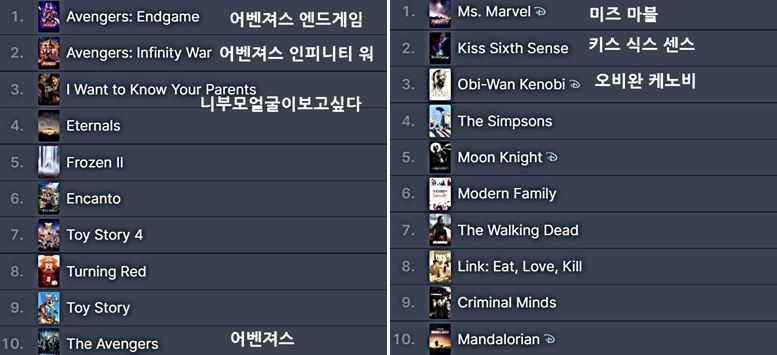 한국 디즈니플러스 영화 부문에서는 어벤져스 엔드게임이 1위를 차지했다. 어벤져스시리즈는 10위 안에 3편이 속해있다.