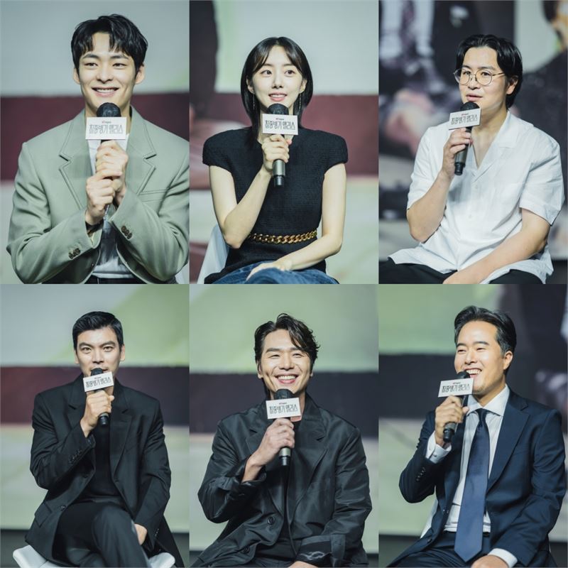 왓챠 오리지널 드라마 '최종병기 앨리스' 온라인 제작발표회가 24일 개최됐다. 배우 김성오(왼쪽부터)-박세완-송건희-서성원 감독-김태훈-정승길(사진=왓챠). ⓒOTT뉴스
