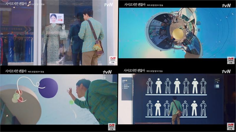 배우 오정세가 자폐 스펙트럼(ASD)을 가진 동화 삽화 작가 문상태로 출연한 tvN 드라마 ‘사이코지만 괜찮아’가 대표적이다. 드라마에서 상태는 어눌한 말투에 상대와 눈을 마주치지 못하는 타인의 시선으로 등장한다. 그러나 상태가 좋아하는 동화작가 문영(서예지 분)의 사인회장까지 걷는 길만큼은 상태의 시선이 담겼다.