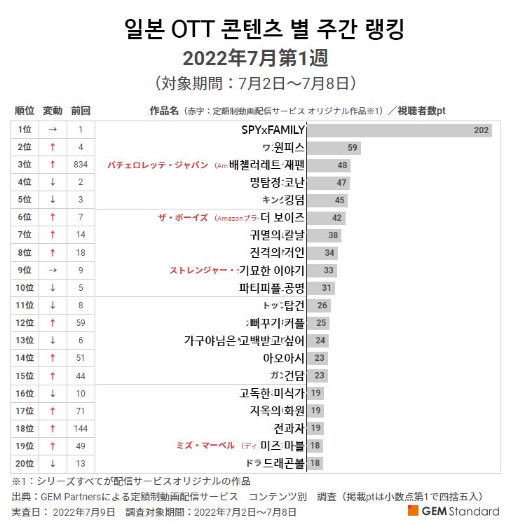 7월 1주차 일본 OTT 순위(사진=GEM Partners). ⓒOTT뉴스