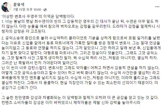 이에 대해 부장 판사 출신의 문유석 작가는 "'이상한 변호사 우영우'의 미덕은 담백함"이라는 글을 남기며 흥행세에 불을 지피는 모습이다.