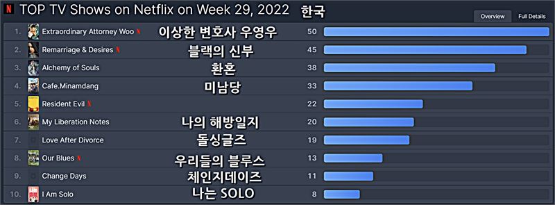 이번 주 한국 넷플릭스 TV 부문 1위는 지난 주에 이어 [이상한 변호사 우영우]가 3주 연속 1위를 차지했다.