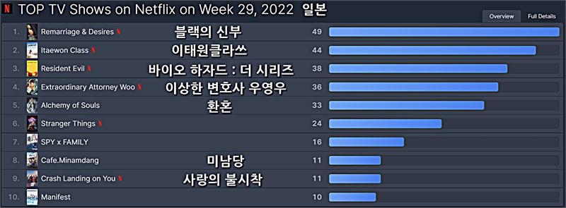 이번 주에는 일본 넷플릭스 TV부문 10위 안에 한국 드라마가 7개 차트인했다.