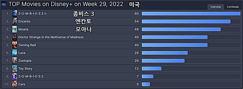 미국 디즈니플러스 영화 부문은 1위는 [좀비스 3]가, 2위는 지난 주 1위인 [엔칸토]가, 3위에는지난 주와 변동없이 [모아나]가 차지했다.