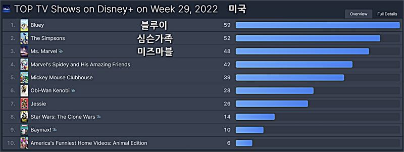 미국 디즈니플러스 TV부문에는 지난 주 1위였던 [블루이]가 3주 연속 1위를 차지했다. [심슨 가족]과 [미즈마블]과 순위 자리를 맞바꿔 각각 2위, 3위가 됐다.