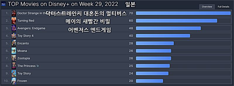 이번 주 일본 디즈니플러스 영화 부문 1위는 지난 주 1위인 [닥터 스트레인지 대혼돈의 멀티버스]가 3주 연속 자리를 지켰다.