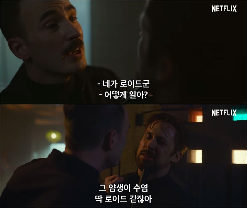 처음 대면하게 되는 식스(라이언 고슬링)와 로이드(크리스 에반스 분)의 대화 (사진=넷플릭스 유튜브 캡쳐) ⓒOTT뉴스