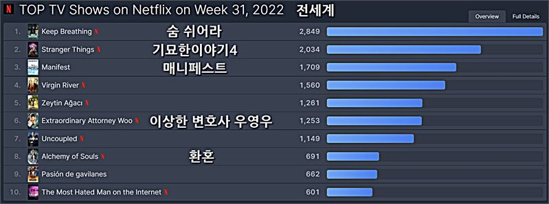 넷플릭스 전세계 2022년 31주차 TV 부문 TOP 10 ⓒOTT뉴스