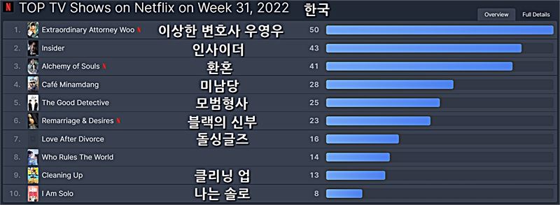 이번 주 한국 넷플릭스 TV 부문 1위는 지난 주에 이어 [이상한 변호사 우영우]가 5주 연속 1위를 차지했다.