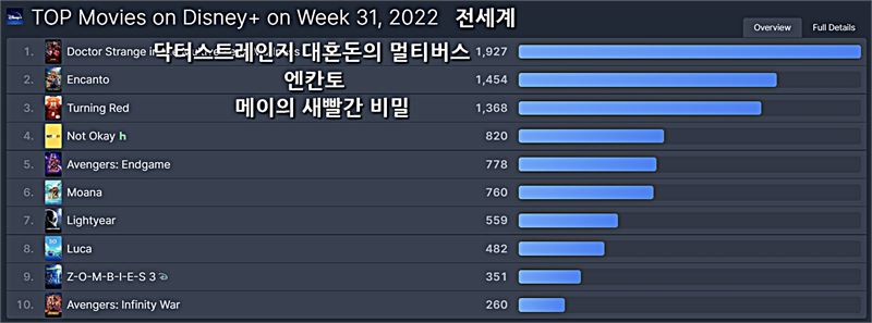 전세계 디즈니플러스 영화 부문 1위는 지난 주에 이어 [닥터스트레인지 대혼돈의 멀티버스]가 차지했다.